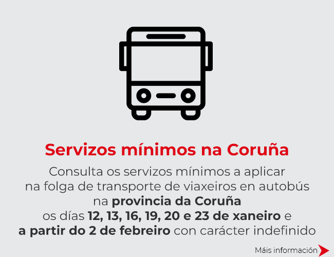 Os días 12, 13, 16, 19, 20 e 23 de xaneiro, e a partir do 2 de febreiro con carácter indefinido, está convocada unha folga por parte das persoas traballadoras do sector de transporte de viaxeiros por estrada da provincia da Coruña. Intentaremos prestar todos os servizos, pero non podemos garantir que se poidan cumprir ao 100%. Trasladámoslles as nosas desculpas por todos os inconvenientes que lles puideran supoñer, e quedamos á súa disposición para calquera aclaración que precisen.