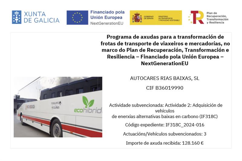 - Programa de ayudas para la transformación de flotas de transporte de viajeros de empresas privadas prestadoras de servicios de transporte por carretera, en el marco del Componente 1 del Plan de Recuperación, Transformación y Resiliencia financiado por la Unión Europea-Next GenerationEU, gestionado por el Ministerio de Transportes, Mobilidad y Agenda Urbana, para la adquisición de nuevos vehículos de energías alternativas bajas en carbono. (IF318C_2022_0007, IF318C_2023_023, IF318C_2023_029 e IF318C_2024_016)